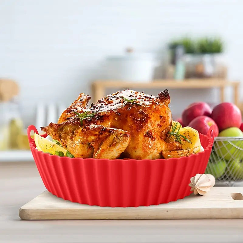 Elevate your cooking experience with our 2pcs Air Fryer Silicone Baking Pan. Designed to make your air frying journey easier and more enjoyable, this set includes two vibrant silicone pans in red and blue, each measuring 8.5 inches in diameter. Perfectly crafted for high-temperature resistance, these pans will withstand the heat of your air fryer without compromising quality.